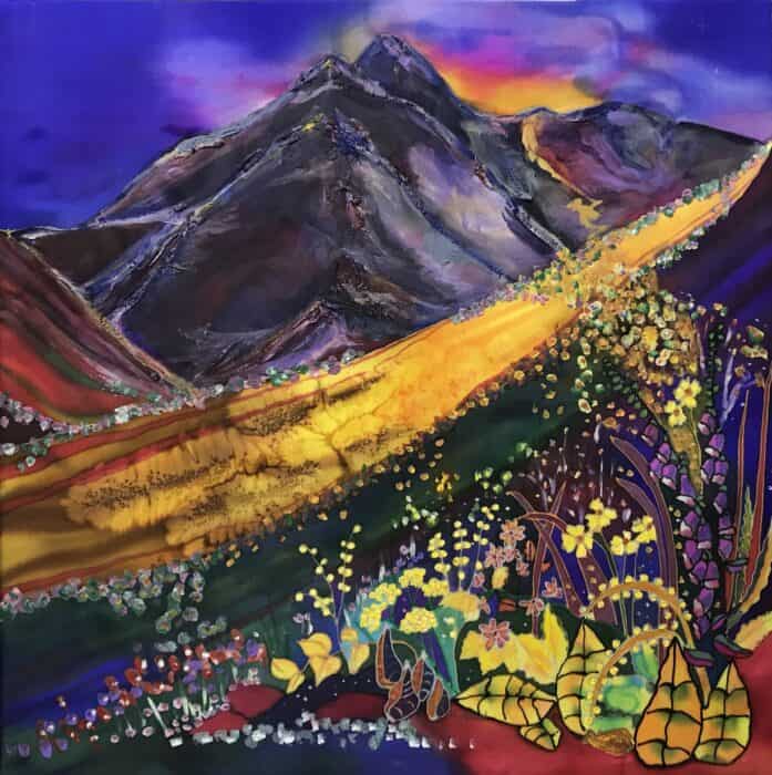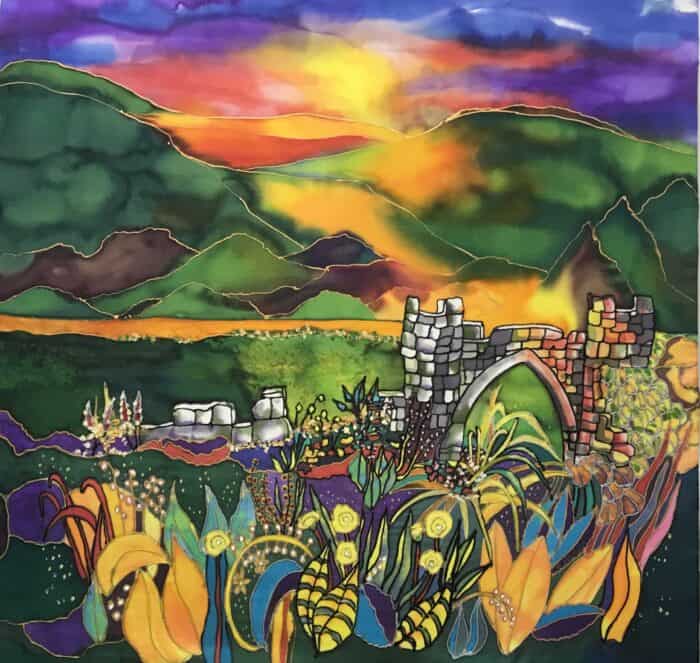 Strongly influenced by the Scottish colourists and the local landscape she paints on silk and canvas creating vibrant and textured of Arran in her own unique style.