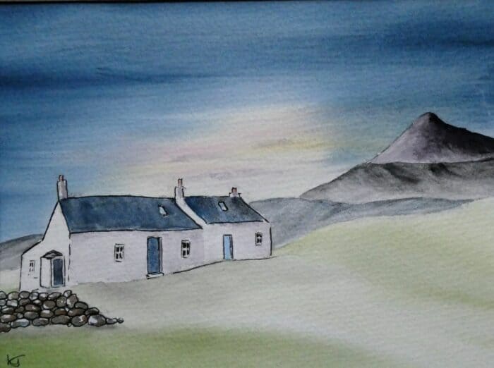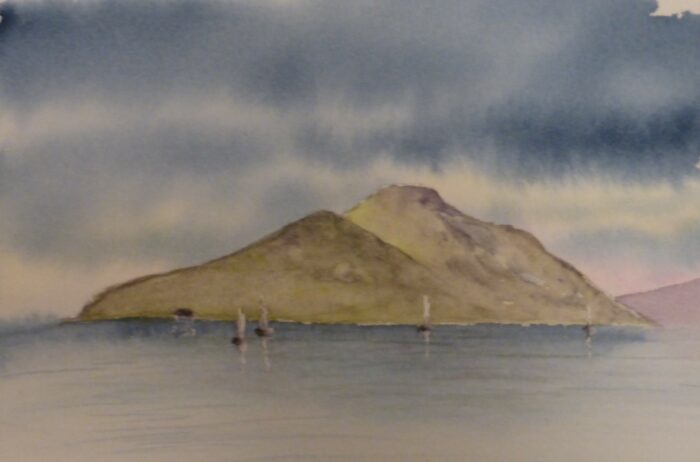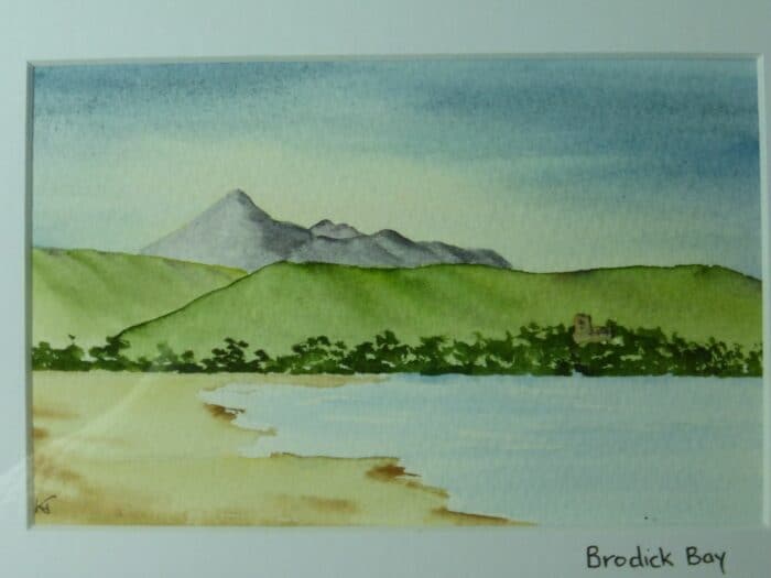 Inspired now by the stunning land and seascapes of Arran she loves to find ways to capture the atmosphere and constantly changing light in watercolour. More recently she has explored ‘felt painting’ and using both wet and needle felting techniques and a touch of embroidery, little tactile scenes of Arran are translated in wool.